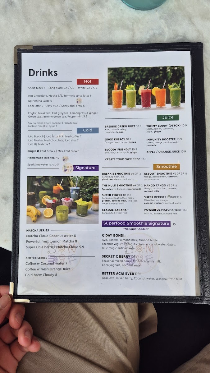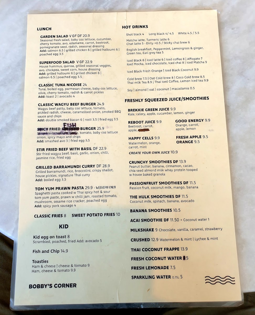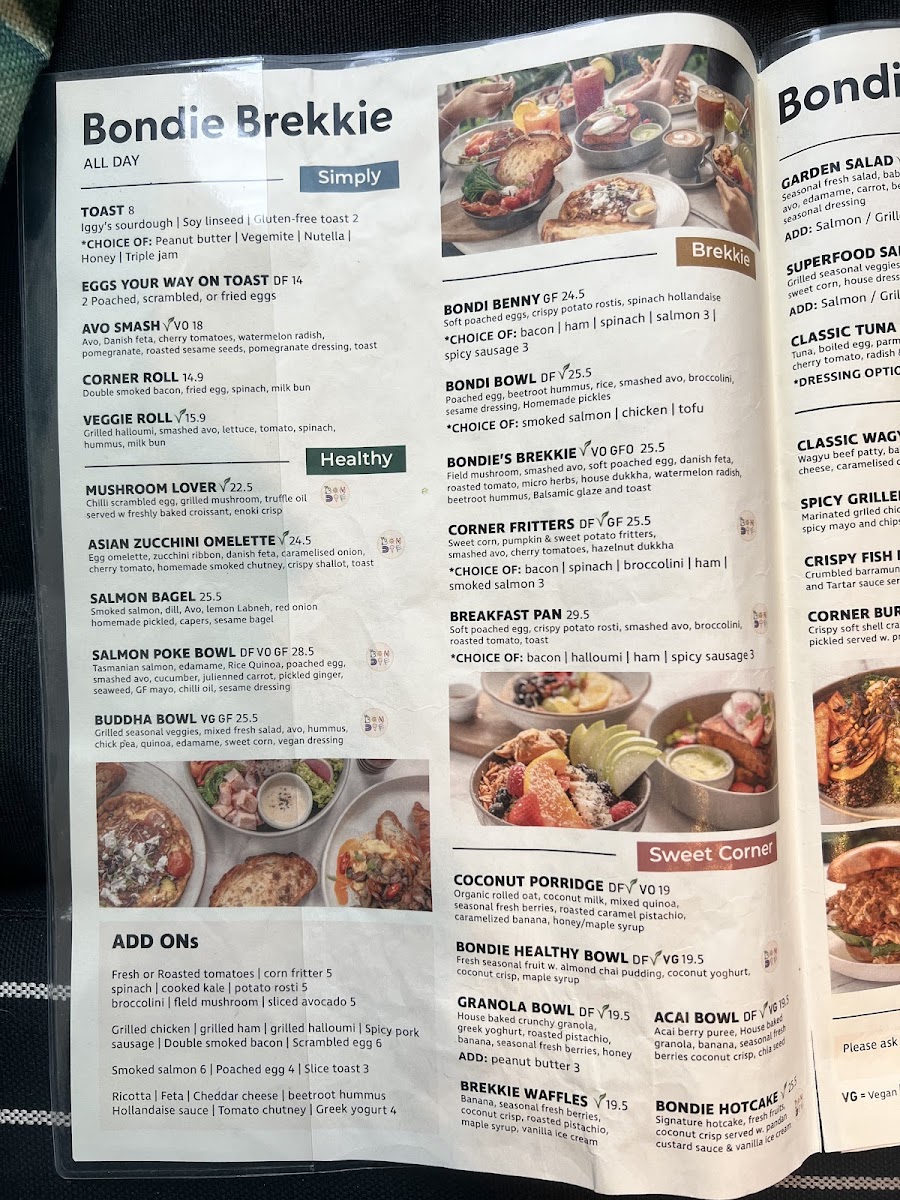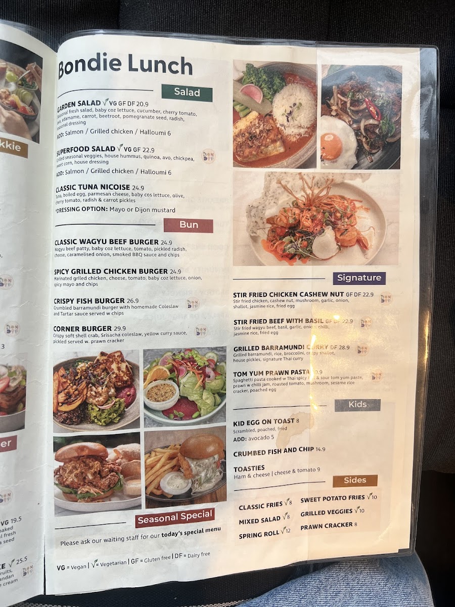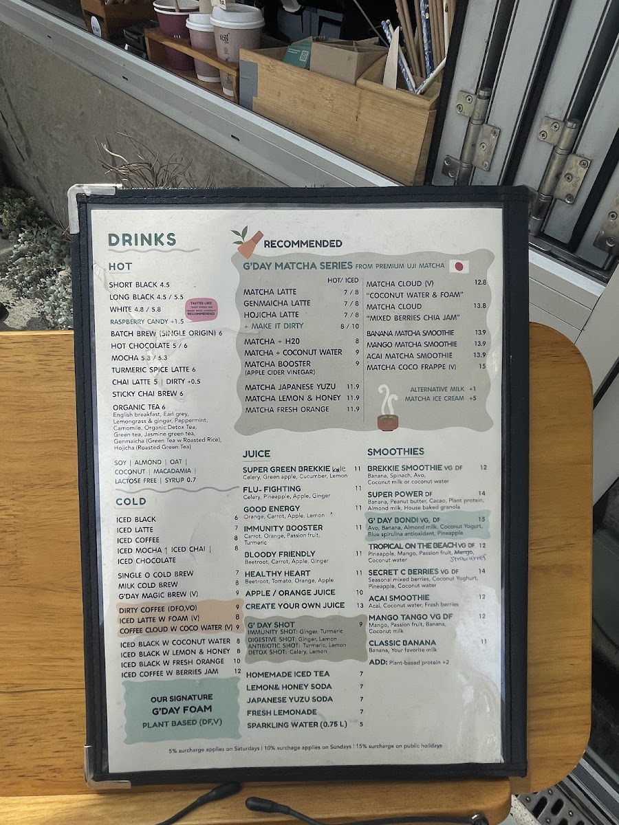 From a reviewer’s perspective, the menu at G’Day Bondi Cafe offers a casual yet diverse selection that leans into fresh, wholesome options, though the absence of listed prices makes it harder to gauge value. The all-day breakfast features simple staples like Toast & Preserver, Eggs Your Way, and Coconut Quinoa Porridge (DF) alongside healthier picks such as House Made Organic Granola and Little Smash (veg). The kids menu keeps things classic with Scrambled or Poached Egg on Toast and Melted Cheese on Toast. For lunch, the East Burger stands out as a straightforward choice, while salads like Roasted Cauliflower Salad, Classic Tuna Nicoise, and Bondi Bowl add lighter alternatives. Beverage options are plentiful, ranging from Regular Coffee and Large Coffee to specialty drinks like Turmeric Latte, Organic OVVIO Tea, and Fresh Sticky Chai Brew, complemented by juices such as Super Green Juice, Reboot Juice, and Fresh Orange Juice, plus customizable blends. Smoothie lovers can enjoy Creamy Passionfruit, The Hulk, and Açai Smoothie Crunchy, as well as the Organic Açai Bowl. The dinner menu introduces more robust flavors with starters like Betel Leaf Platter, Smashed Eggplant Dipping Sauce, and Chicken Gor Lae (DF, GF), followed by mains such as Yum Hua Plee, Nam Tok Beef, Larb Gai, Kao Soi, and Massaman, rounding out a menu that feels globally inspired yet relaxed in execution.