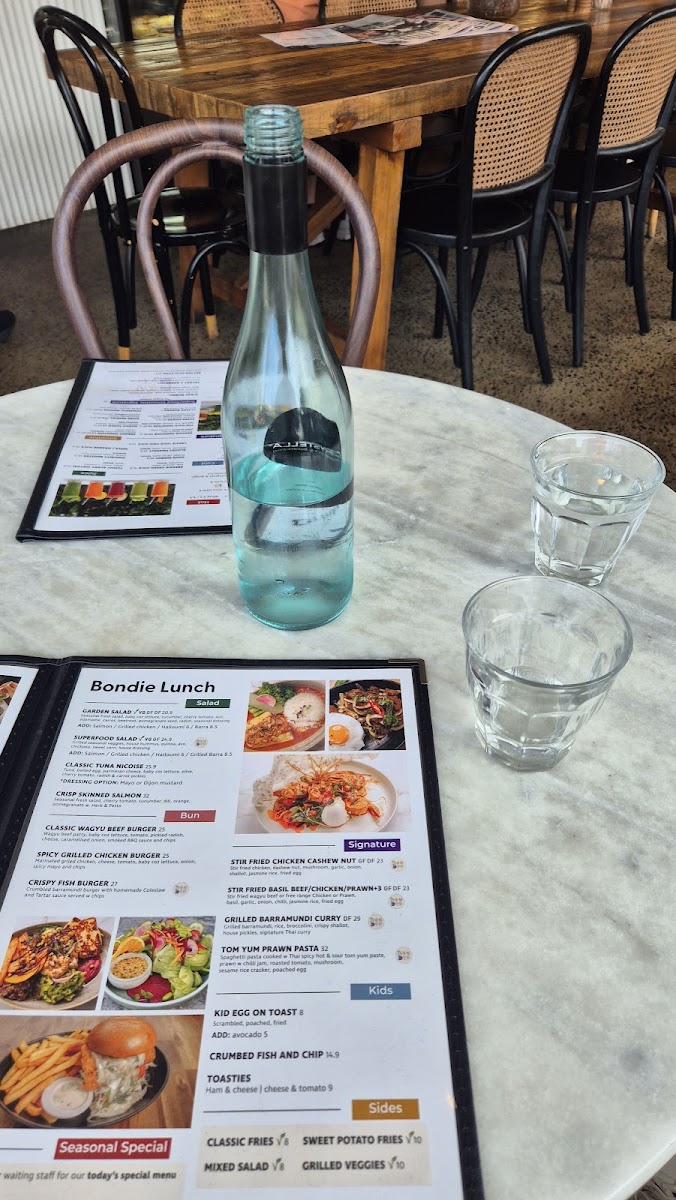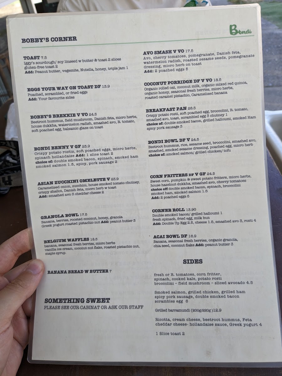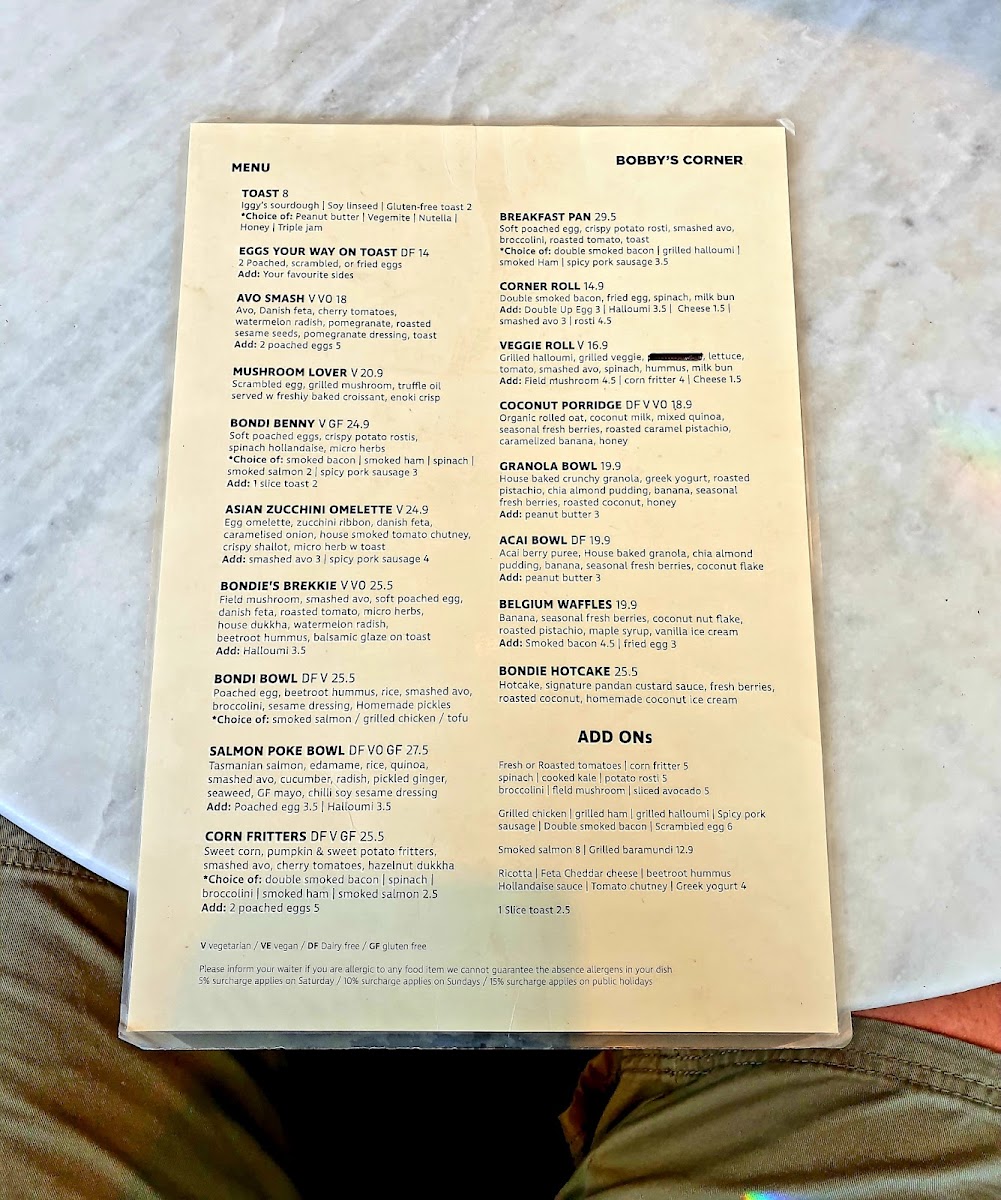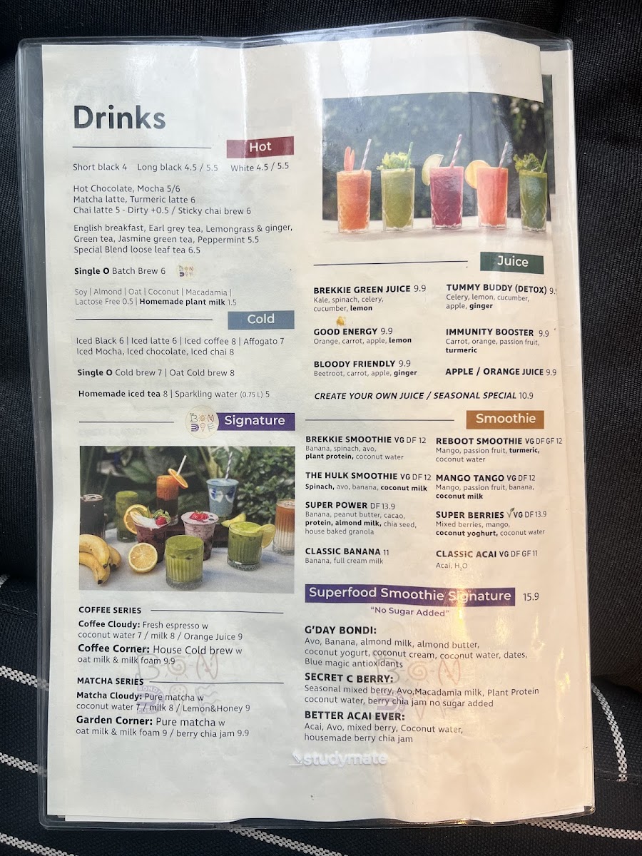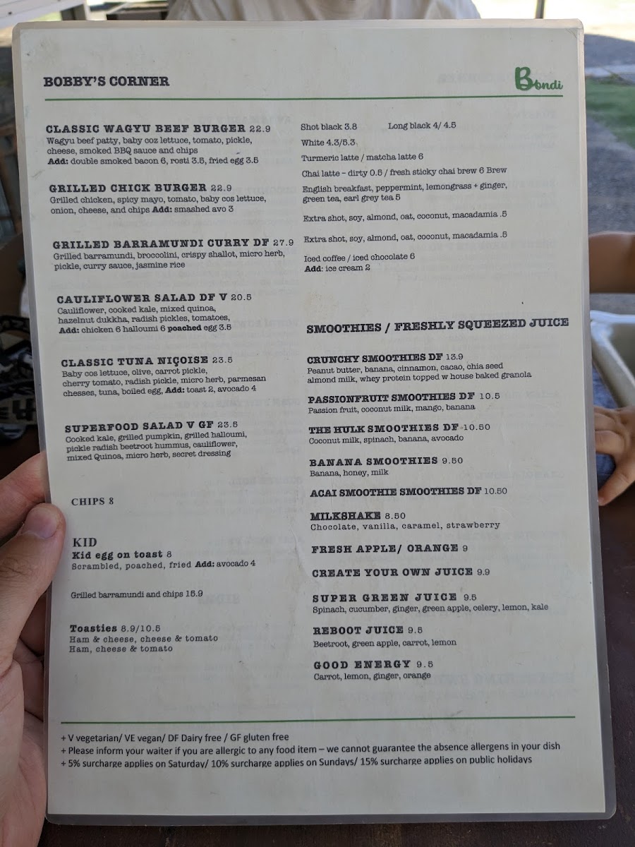 From a reviewer’s perspective, the menu at G’Day Bondi Cafe offers a casual yet diverse selection that leans into fresh, wholesome options, though the absence of listed prices makes it harder to gauge value. The all-day breakfast features simple staples like Toast & Preserver, Eggs Your Way, and Coconut Quinoa Porridge (DF) alongside healthier picks such as House Made Organic Granola and Little Smash (veg). The kids menu keeps things classic with Scrambled or Poached Egg on Toast and Melted Cheese on Toast. For lunch, the East Burger stands out as a straightforward choice, while salads like Roasted Cauliflower Salad, Classic Tuna Nicoise, and Bondi Bowl add lighter alternatives. Beverage options are plentiful, ranging from Regular Coffee and Large Coffee to specialty drinks like Turmeric Latte, Organic OVVIO Tea, and Fresh Sticky Chai Brew, complemented by juices such as Super Green Juice, Reboot Juice, and Fresh Orange Juice, plus customizable blends. Smoothie lovers can enjoy Creamy Passionfruit, The Hulk, and Açai Smoothie Crunchy, as well as the Organic Açai Bowl. The dinner menu introduces more robust flavors with starters like Betel Leaf Platter, Smashed Eggplant Dipping Sauce, and Chicken Gor Lae (DF, GF), followed by mains such as Yum Hua Plee, Nam Tok Beef, Larb Gai, Kao Soi, and Massaman, rounding out a menu that feels globally inspired yet relaxed in execution.